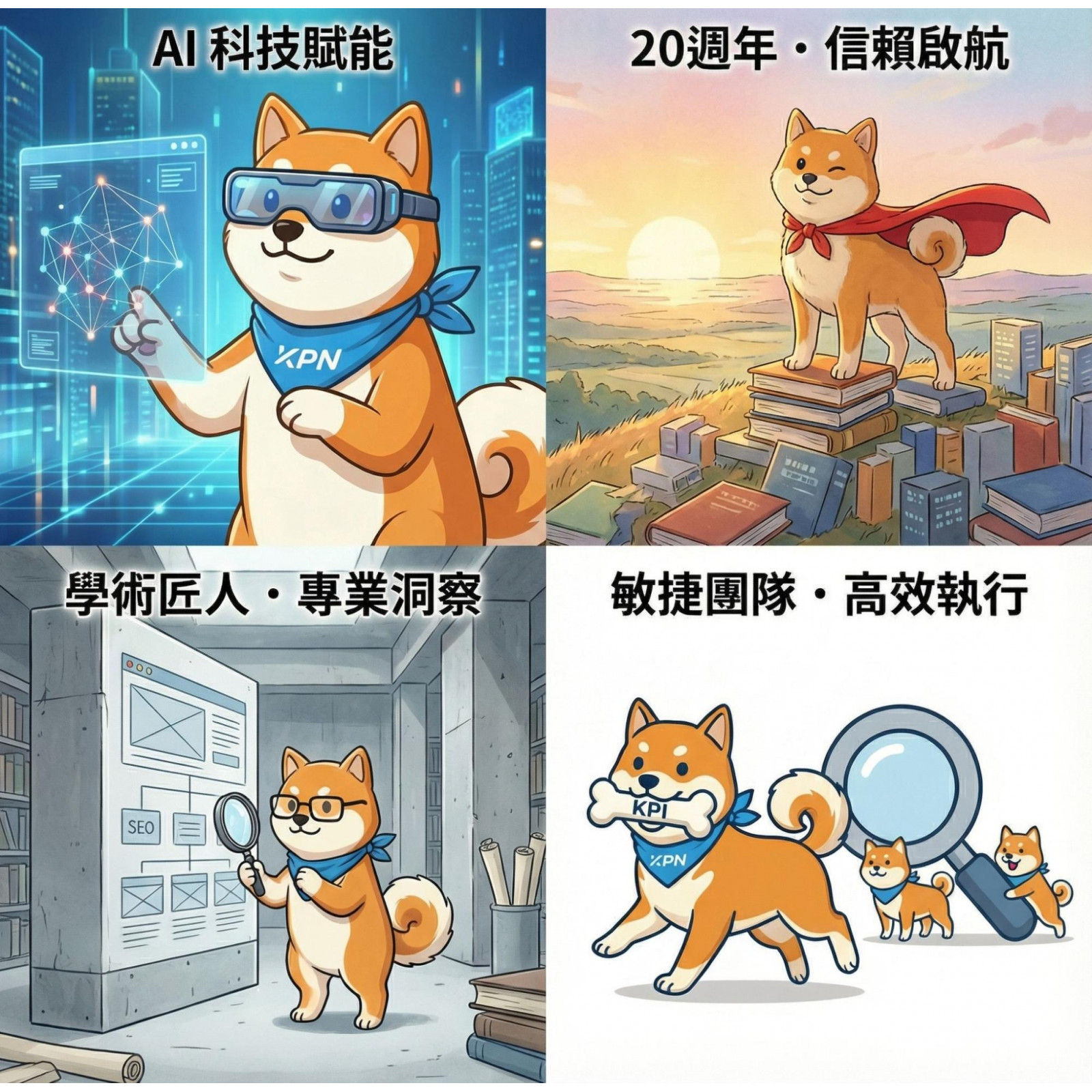 提示語:「請使用同一隻柴犬角色:橘白色、短腿、捲尾、帶著藍色領巾(印有 KPN 字樣)。風格為可愛插畫,線條乾淨,背景柔和、顏色飽和但不刺眼。請維持四張圖片中的柴犬外貌一致,包括耳朵形狀、身形比例、臉部表情與毛色分布。」