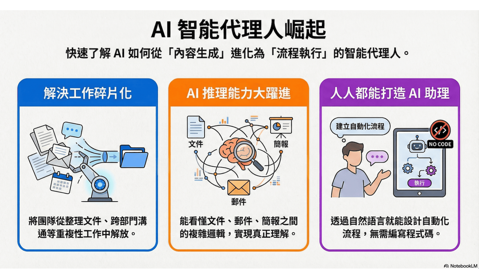 近兩年,AI 在企業內部的角色快速進化:從生成文案、分析報表,走向具備推理能力、可主動執行流程的 AI agents。Google Workspace Studio 的推出正是回應市場對「自動化」與「跨工具整合」需求的高漲。