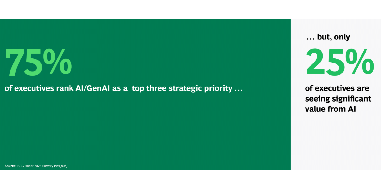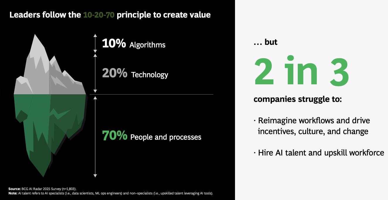 BCG 的《2025 AI 雷達》報告揭露了一個驚人的數據:雖然 75% 的全球高管將 AI 列為前三大戰略優先事項,但僅有 25% 的企業看到了顯著的價值回報 。