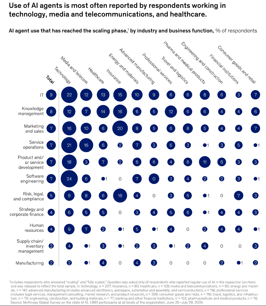 圖表佐證:根據 McKinsey 報告顯示,AI 代理人的應用正在快速升溫,特別是在 IT 與知識管理領域。