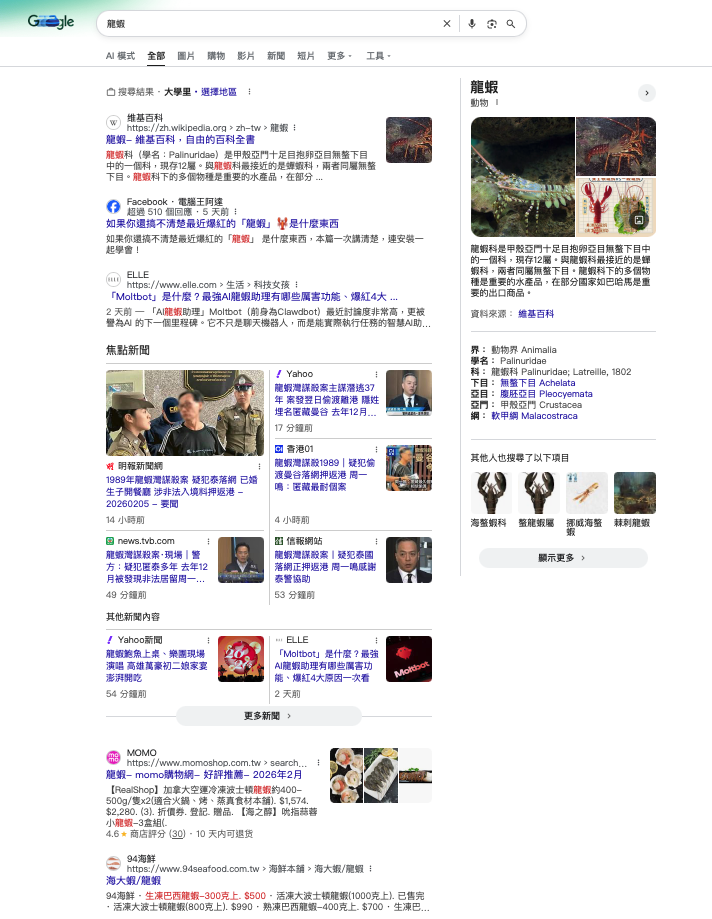 註:此截圖顯示多數結果仍為生物/新聞/料理等內容(以海鮮龍蝦為主)。