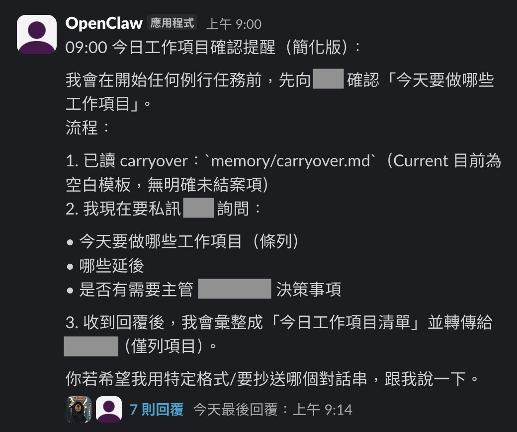 早晨 09:00 的「晨間喚醒」: 蝦寶會準時與執行同仁對接,主動詢問:「今日的重點工作項目有哪些?」