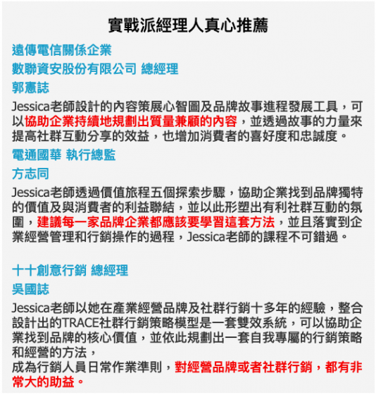 本課程將針對消費者樣貌、品牌價值體驗、眼球誘因、通路生態系、內容策展逐一解密,課程中將傳授四大策略模型,協助企業改善顧客體驗、提高社群商機,並解決目前社群觸及率及參與度過低的問題,達到社群行銷效益之最佳化。
