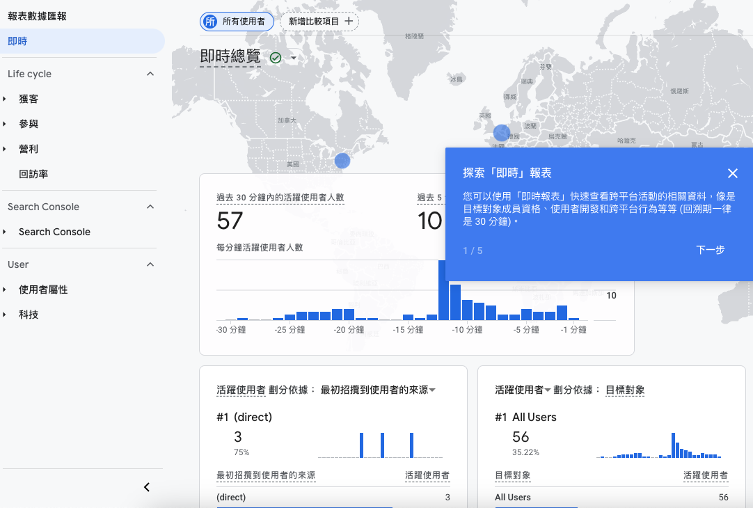 GA4 即時報告(Realtime Report)主要功能是讓您能夠查看過去 30 分鐘內的使用者活動,包括使用者人數、流量來源、及使用的媒介。這些數據每分鐘更新一次,非常適合需要即時監控流量變化的情境,例如: