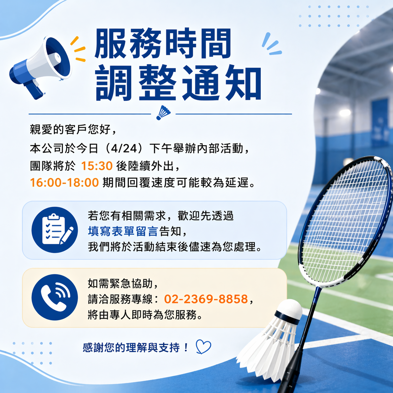 服務時間調整通知